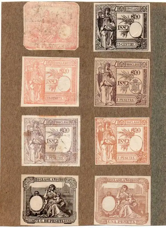 NUM019 LOTE DE 8 SELLOS FISCALES PEGADOS SOBRE CARTULINA ESPAÑA DE 1891 A 1893